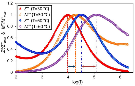 The combined plots of and against frequency are usually used to identify whether the short-range or long-range motion of free carriers is dominant in the relaxation process. The mismatch of frequency peaks between and reflects that the short-range movement of free carriers is the predominant process and departs from the ideal Debye-type model, whereas the coincidence of the frequency peaks at a similar frequency implies that the long-range movement of free carriers is dominant [47]. The frequency response of normalized and for the sample with 2 wt.% of ZnO-NPs at temperatures 30 and 60 °C was represented in Figure 9. From this figure, it is noticed that the and peaks do not concur, indicating the short-range movement of free carriers and non-Debye relaxation processes in the present proton-conducting NSPE sample. The mismatch between the and peaks become larger with increasing temperature, which suggests the increases in the portion of the short-range movement of free carriers with increasing temperature. This result is in accordance with previous works, which suggest that the conductivity increases with increasing temperature.