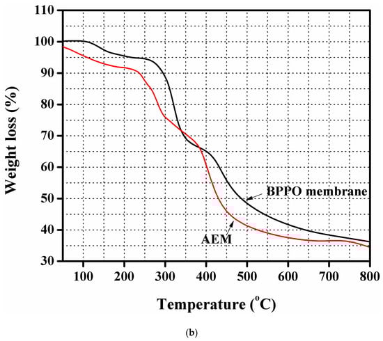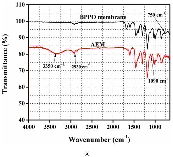 Figure 1a depicts FTIR spectrums of pure BPPO membrane as well as the prepared DMEA-grafted AEM. It was observed that a new peak appeared in the DMEA-grafted AEM at 1090 cm−1. It was because of the C-N stretching vibration into the spectrum of the DMEA-grafted AEM. It denoted the synthesis of the DMEA-grafted AEM, which was not present in the pure BPPO membrane. In the prepared DMEA-grafted AEM, the broad peak at 3350 cm−1 was due to the stretching vibration of an OH group. Moreover, the peak at 750 cm−1 was associated with the C-Br stretching vibration in the pure BPPO membrane [40]. It was not seen in the FTIR spectrum of the DMEA-grafted AEM [45,50]. The peak at 2930 cm−1 became broader because of the attachment of methyl groups (-CH3) containing DMEA to the polymer architecture [49]. It authenticated the successful synthesis of DMEA-grafted AEM.