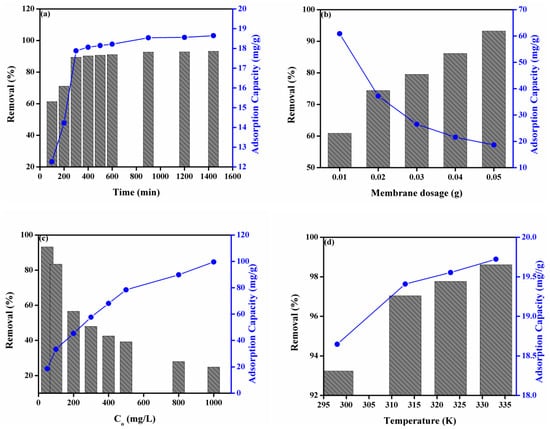 (a) Effect of contact time, (b) membrane dosage (adsorbent), (c) initial concentration of aqueous dye solution, (d) temperature on the percentage discharge of MO from aqueous solution and adsorption capacity.