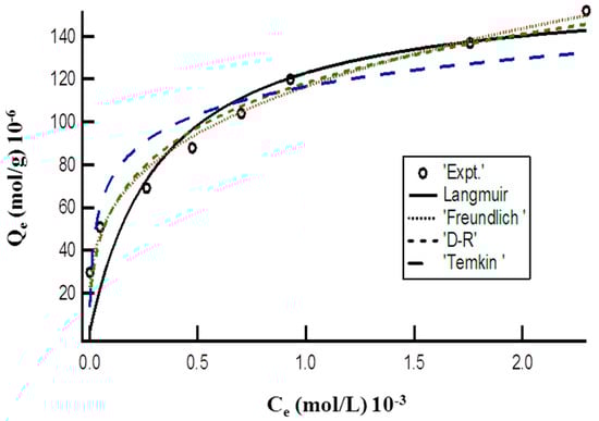 3.6.1. Two Parameters Nonlinear Adsorption Isotherms