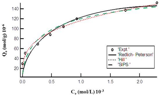 Plot of equilibrium concentration (Ce) vs. adsorption capacity (Qe) representing nonlinear Hill, R-P, and SIPS isotherms for adsorption of MO onto the DMEA-grafted AEM.
