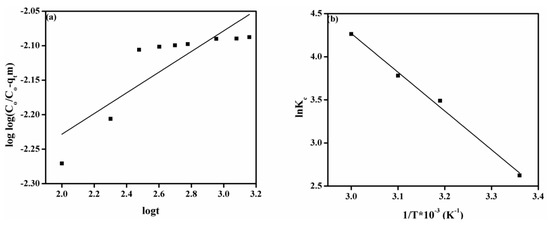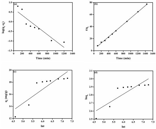 Figure 5a denotes the plot of pseudo-first-order model for adsorption of MO onto the DMEA-grated AEM, and attained values of parameters such as k1 and qe are given in Table 2. The value of the correlation coefficient (R2) was 0.836. There were also large differences between experimental adsorption capacity (qe and exp.) and calculated adsorption capacity values (qe and cal.), indicating that a pseudo-first-order model can not explain the rate process. The plot of the pseudo-second-order model is shown in Figure 5b. From Table 2, it can be noted that the value of experimental adsorption capacity (18.65 mg/g) was close to the calculated adsorption capacity (19.61 mg/g). The value of the correlation coefficient (R2 > 0.999) was close to unity, demonstrating that the model fit the experiment data well. Similarly, the plots of the Elovich model and the modified Freundlich equation are shown in Figure 5c,d, respectively. As shown in Table 2, the value of values of correlation coefficient (R2) were 0.724 and 0.708 for the Elovich model and the modified Freundlich equation, respectively, show that these models were not suitable for explaining the experimental data. Moreover, the plot of the Bangham equation is represented in Figure 6a, and the calculated values of its endowment are given in Table 2. It did not provide a linear curve representing the diffusion of adsorbate (MO) into pores of the adsorbent (the DMEA-grafted AEM), showing it was not the only rate-limiting step [14] because both film and pore diffusion were crucial to different extents for the adsorption of MO from aqueous solution onto the DMEA-grafted AEM.