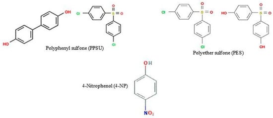 Polyphenylsulfone (PPSU, MW = 400.45 g/mol) supplied by Solvay Advanced Polymers (Brussels, Belgium) and Polyethersulfone (PES, MW = 232.26 g/mol) supplied by Sigma-Aldrich (St. Louis, MO, USA) was selected as the membrane material. Dimethyl sulfoxide (DMSO) was purchased from Sigma-Aldrich (St. Louis, MO, USA) and utilized as a solvent. 4-Nitrophenol (C6H5NO3, 99% purity) was used as received from Sigma-Aldrich (Shanghai, China) and Sodium hydroxide (NaOH, 97% purity) was obtained from (Shanghai, China). All chemicals were used as received without further purification. The chemical structure of PPSU, PES and 4-nitrophenol are given in Figure 1.