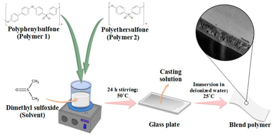 Five blend membranes were prepared via the classical phase separation technique Figure 2). Composition of the membranes was given in Table 1. Briefly, a 20% wt.% of PPSU and a certain amount of PES were dissolved in 80 wt.% DMSO and mechanically stirred overnight until a homogeneous casting solution was obtained. Following that, a proper amount was sprinkled on the glass plate and cast with a clearance gap of 200 µm. Thereafter, the prepared membrane was immersed in a deionized water bath to finalize the phase inversion process. The fabricated membranes were repeatedly rinsed with DI water and stored until further use. More details were presented elsewhere [27,28]