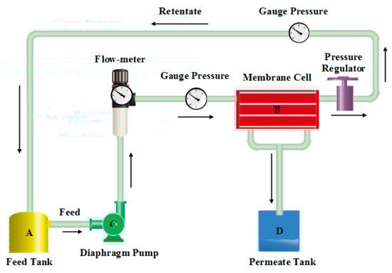 All NF membrane flux and retention tests were conducted utilizing a custom-made cross-flow filtration set up with an effective membrane area of 16 cm2 at a low feed flow rate (1.4 L/min) and low operating pressure (3 bar). Figure 3 describes the schematic diagram of the experimental which equipped with a feed tank having a capacity of 1 L, membrane module, flowmeter and pressure gauges. The feed solution was fed through the membrane module by a diaphragm pump (working pressure =100 psi and flow rate of 25.4 GPH).