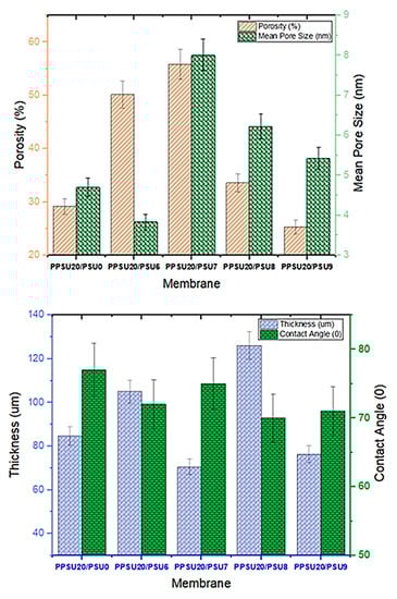 Nevertheless, the effect of PES addition was explicit on the membranes porosity, however, this effect was trivial and did not follow any trend for the mean pore size measurements (Figure 5, Top). Comparing to the lowest witnessed porosity (29.17%) of the control PPUS membrane, the membrane prepared with 6 wt.% and 7 wt.% PES has manifested an increased porosity value to about 50.13% and 55.81%, respectively. However, further addition of PES up to 8 wt.% and 9 wt.% has led to a decline in the porosity to 33.60% and 25.29%, respectively. This phenomenon was attributed to the reduction in solubility parameter difference between the polymer mixture and NMP solvent with increasing of PES as reported in the literature [23]. This means that the chains of PES have lower impact on the NMP solvent than the PPSU, therefore fast rate of diffusion of NMP and water could take place, which in turn results to membrane with high porosity and pore size.