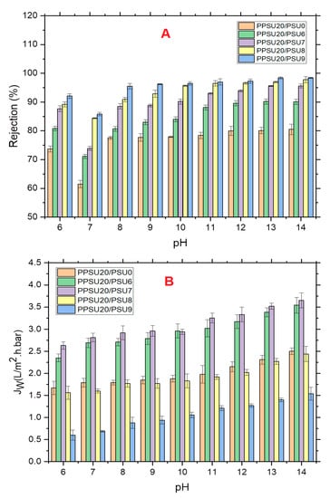 The present study focuses on the rejection of 4-NP at basic pH values, as shown in Figure 6A. Unsurprisingly, retention of all blend membranes manifested an increasing trend with racing the pH values. This was ascribed to the fact that at the alkalinity conditions, both membranes and 4-NP molecules are negatively charged. Herein, strong electrostatic charge repulsions would take place to hinder 4-NP molecules deposition on the membrane’s surface. Thus, the membrane would experience a higher rejection performance. In the meantime, increasing the PES content within the PPSU membrane matrix resulted in higher rejection capabilities. For instance, blend membrane with 9%PES experienced 98% 4-NP removal at pH14 comparing to only 81% removal for nascent PPSU at the identical operational conditions. Meanwhile, solute permeation showcased an increasing trend with increasing the pH values for all membranes. However, at certain pH values, the blend membranes permeation behaved differently depending on their porous structure (Figure 6B). Permeation of solutions containing 4-NP molecules manifested an increase by the addition of PES up to 7% and then decreased afterwards. The unusual peculiarities of high water flux for the membrane fabricated from 7 wt.% of PES as a polymer blend was attributed to the porous membrane structure resulted from the optimum exchange rate between polymer blend solution and water. Solubility parameter difference between the polymer mixture and NMP solvent decreased with increasing of PES as reported by Ghadhban et al., [26]. This means that the chains of PES have lower impact on the NMP solvent than the PPSU, it means that fast rate of diffusion of NMP and water, which in turn results to membrane with high porosity and pore size. It should be noted here that separation of organic solutes, such as 4-NP, by NF membranes could be a complicated process. The separation could be influenced by several mechanisms e.g., electrostatic charge repulsion and adsorption phenomena and not only limited to size exclusion. At some circumstances, electrostatic charge interactions could endow a higher retention against small charged organic pollutant if compared with the effects of size exclusion. From the other side, adsorption of organic components with hydrophobic character could be significant during the filtration of ionizable components when they are electrostatically neutral and ultimately solute permeation tend to decrease significantly. Herein, 4-NPs have revealed increasing retention behaviour at the pH range used because of their acid dissociation constant (pKa = 7.15) [36]. This implies that, if pKa was greater than solution pH, 4-NP molecules would be presented in both forms; ionized (4-NPO−) and un-ionized (4-NP) species. Whereas in case of pKa was smaller to solution pH, all 4-NP molecules would be only as ionized (4-NPO−) species. In acidic and neutral conditions, 4-NP molecules could have less negative charges implying that just few of these molecules are ionized and have negative charges. Whereas, all 4-NP molecules in basic solutions possess only negative net charges because of the complete ionization of the phenolic hydroxyl group to yield the phenolate ion [23]. The influence of the PPSU/PES ratio on the permeation and separation performance of the membranes under various pH conditions were illustrated in Figure 7, below.