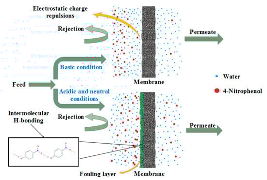 Worth mentioning, during the prolonged operation, rejection of 4-NP molecules has declined with time and reached a constant value. This has indicated that a layer of 4-NP was formed at the surface of the membrane. However, the drop in the rejection of 4-NP was varying depending on the pH solution condition (Figure 8). The observed decline in the retention of 4-NP molecules was trivial at basic solution comparing to the acidic and neutral conditions. This could be described depend on the dominant mechanism contributing to the retention of 4-NP molecules. Within alkaline conditions, electrostatic repulsion between both negatively charged membrane surface and 4-NP molecules were initially crucial for the removal of the solutes. Hence, retention values did not change noticeably over time because of unpretentious adsorption of 4-NP on the surface of blend membrane. However, in acidic conditions, the retention of 4-NP declined as the time passes due to rapid deposition of solutes and the formation of intermolecular hydrogen bonds on the surface of the membrane. This decline in retention continues to reach the steady-state conditions according to the conditions of the solution.