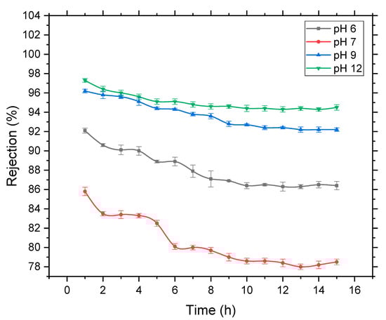 Rejection of 10−4 M 4-NP solution versus time using PPSU20/PES9 membrane at various solution pH, 25 °C, and 3 bar.