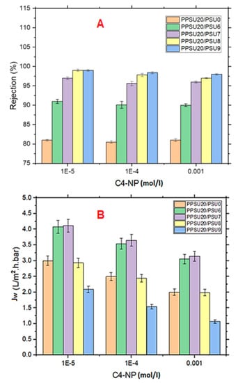 Blend membranes rejection (A) and permeation (B) using 10−4 M 4-NP (1 h, 25 °C and 3 bar).