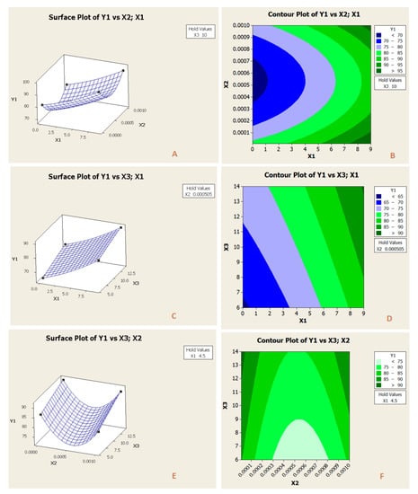 Figure 10 and Figure 11 illustrated the surface and contour plots of the standardized impacts of rejection and permeate flux, respectively. It can be inferred clearly that the feed concentration, pH, and characteristics of the membranes were pivotal and played an essential role during the operation. Figure 10A,B, presented the effect of the two factors, PES concentrations, x1 and feed concentrations, x2, when the third-factor acidity measure, x3 was held at 10. As it can be noticed in the figure, the rise of PPES concentration up to 9 wt.% led to an increase of retention coefficient (y1) up to 98%, while the variation of feed concentration had a less significant influence on retention coefficient.