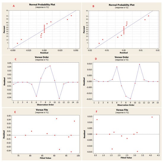 The residual graph was introduced to examine the goodness-of-fit in ANOVA analysis Figure 13B,C. The graph has displayed the independent parameters on the x-axis whereas the residuals were on the y-axis. It can infer the crucial assumptions about the errors: The errors were independent of each other and the better method to gain an independent error was through ordering the run of experimental trials randomly. The errors difference does not alteration for the various level of parameters. It also evident that the difference of the errors does not change according to the values of the expected response, clarified in Figure 13E,F.