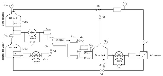 A preliminary analysis in reverse osmosis (RO) mode was conducted to determine the water permeability (A) and salt permeability (B) of the membrane used in the two CTA-HF and PA-SW modules. Figure 2 presents a schematic of the evaluation system of a pilot-scale PRO module. The system was the same as in a previous study [35], and was also used for the RO evaluation test in this study. The concentration of FS in the test was 500 ppm NaCl. To operate the system in RO mode, valve V2 was completely closed, so that the permeated water flowed out from the outlet at the FS side of the module. The activated carbon-treated tap water was fed into the DS side of the membrane module with an inlet flow rate of 4.0 L/min. The applied pressure difference between the DS and FS was carefully controlled, using valve V3. The water permeation flux was measured, using a flow meter at the FS outlet. The A (m s−1 Pa−1) value was then determined from the slope of the graph plotted for water flux over the applied pressure according to Equation (1):