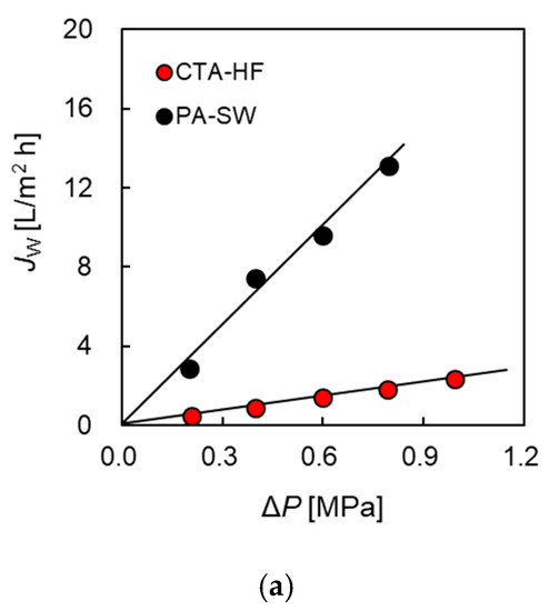 Figure 3a shows the water flux of PA-SW and CTA-HF plotted over the applied hydrostatic pressure (ΔP). The water flux increased with an increase in ΔP. The water permeability (A value) was obtained from the slope of the solid line calculated by fitting the data to Equation (1) and gives 0.65 × 10−12 and 4.6 × 10−12 [m s−1 Pa−1] for CTA-HF and PA-SW, respectively. The water permeability of PA-SW was approximately seven times higher than that of the hollow-fiber membrane module (CTA-HF). In general, the water permeability of a PA membrane is higher than that of a CTA membrane because the PA membrane has a thinner active layer than that of the CTA [4,42].