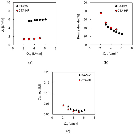 In the case of 1.2 M DS, Jw of CTA-HF at 6.0 L/min of QFS was 1.56 times higher compared to that in the case of 0.6 M though ΔP increased from 1.2 to 2.5 Mpa, because the increase in Δπ as the driving force of the water flux, as shown in Figure 5a. On the contrary, Jw of PA-SW showed a low value of 85% of Jw in the case of 0.6 M NaCl. This is because the increase in the effective osmotic pressure difference in PA-SW did not increase linearly, as mentioned in Section 3.2.2. As shown in Figure 5b, the permeation rate in CTA-HF reached 100% at the lowest QFS (<2.5 L/min), and CFS,out of the module had a high value of approximately 0.3 M, as shown in Figure 5c. Although the Jw of CTA-HF is lower than that of PA-SW, the total membrane area of the former is more than four times larger than that of the latter; hence, the permeate water flow from the FS to the DS sides in the former module was larger than that in the latter. Therefore, an FS flow rate of 2.5 L/min is not sufficient for CTA-HF to prevent FS up-concentration. CFS,out decreased dramatically as QFS increased, and permeation rate decreased to less than 50% at 6.0 L/min of QFS, while that of PA-SW decreased from 40% to 20% at 6.0 L/min of QFS. Hence, these data indicate that 5.0 a QFS of is sufficient for both modules to mitigate FS up-concentration even at a high DS concentration of 1.2 M.