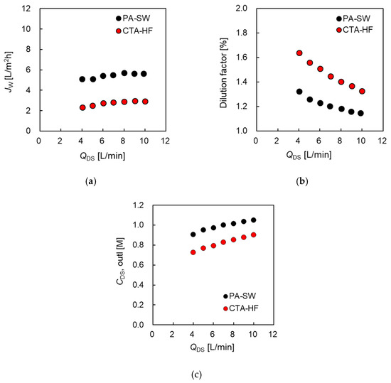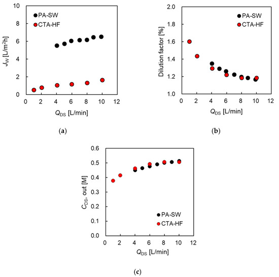 Figure 6a shows that Jw increased from 0.53 at 1.0 L/min to 1.7 L/m2h at 10 L/min of QDS for CTA-HF and from 5.3 at 4.0 L/min to 6.5 L/m2h at 10 L/min for PA-SW as QDS increased, even as it approached the maximum flow rate of the pump. As φ approaches 1, it indicates that QDS,out is equal to the DS flow rate at the inlet. In this case, φ decreased from 1.58 at 1.0 L/min to 1.18 at 10 L/min (CTA-HF) and from 1.33 at 4 L/min to 1.17 at 10 L/min (PA-SW), as shown in Figure 6b. In the case of CTA-HF, CDS,out increased from 0.38 M at 1.0 L/min to 0.51 M at 10 L/min, 63% and 85% of the DS inlet concentration, respectively. In the case of PA-SW, CDS,out increased from 0.45 M and 0.51 M, 75% and 85% of the DS inlet concentration, respectively, as QDS increased, as shown in Figure 6c. This indicates that a 10 L/min of DS flow rate is not sufficient for both modules to be negligible in the DS dilution effect by the permeate water flow from the FS side.