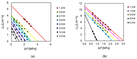 where Jw is the water flux (L m−2 h−1), ΔP is the hydraulic pressure difference, and Δπ is the osmotic pressure difference. To determine the value of B, Equation (2) was applied [25]: