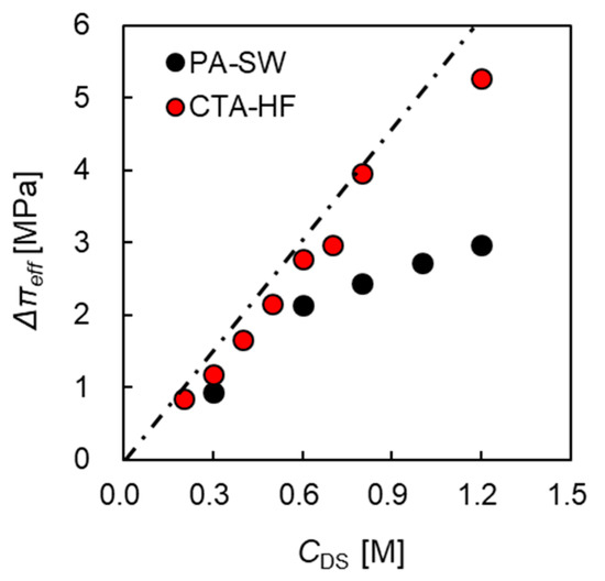 Here, the pseudo-water permeability in PRO mode () and effective osmotic pressure difference () were obtained from the slope and intersection of the x-axis of the empirical line shown in Figure 8. The relationship between and CDS is shown in Figure 9. The broken line represents the theoretical osmotic pressure difference () calculated by using the van’t Hoff equation. This figure shows that increased as CDS increased, and of the two modules was lower than . Additionally, PA-SW exhibited a greater deviation between and , especially at high CDS. In contrast, CTA-HF shows a small deviation between the two values, and from the relationship between and CDS shown in Figure 9, inside the module in the PRO test is estimated by using Equation (19), and αmod is calculated as 0.88: