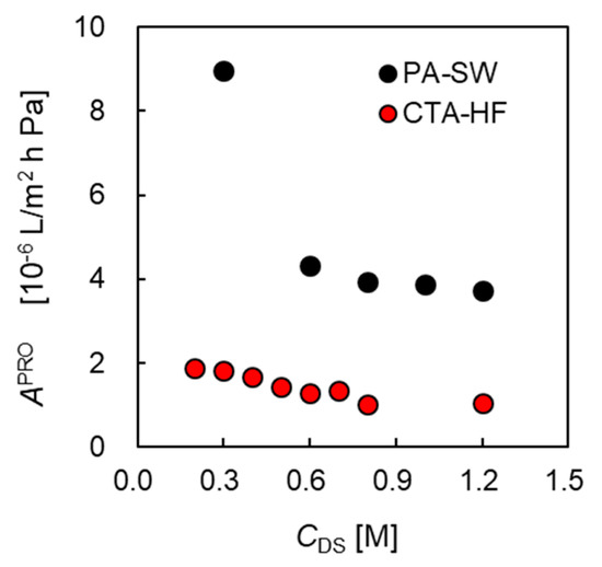 Figure 10 shows the apparent water permeation coefficient as a function of CDS. The of CTA-HF decreased gradually from 1.9 at 0.2 M NaCl to 1.0 [L/m2 h Pa] at 1.2 M of CDS, which is similar to the decrease of the CTA-HF reported in a previous study [43] named as M-HF in Table 2. of PA-SW decreased drastically from 9.0 at 0.3 M of CDS to 3.7 [L/m2 h Pa] at 1.2 M DS. As shown in Figure 9 and Figure 10, the drastic decrease in and of PA-SW is due to the concentrated ICP inside the support layer of the PA membrane involving the DS leakage because the membrane has lower salt rejection than the CTA membrane, as shown in Figure 3b. Another factor may be the complex FS flow channel structure of the PRO SW module in a U-fashion [48]. It may be difficult for the channel structure to flush the DS leakage at a high CDS.