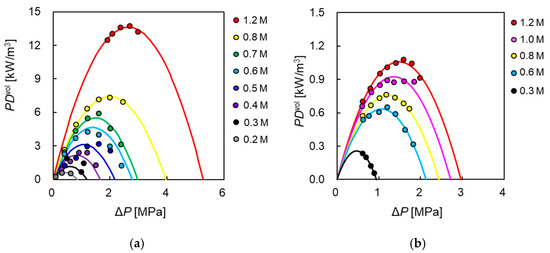 Many PRO evaluations in the literature [10,12,13,19,20,21,22,23,24,25,26,27,28,29,30,31,32,33,34] are based on the power density per membrane area to characterize the membrane performance. The membrane area-based power density (PDarea) is defined as the effective membrane area-based power density and is calculated by using Equation (9):
