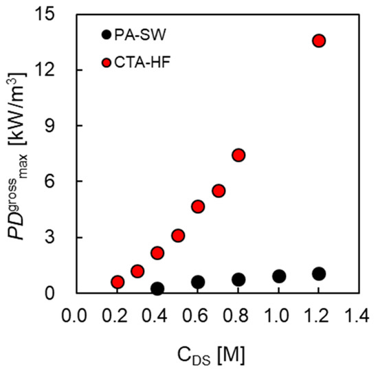 The maximum power density per unit membrane area () of PA-SW was 2.03-fold higher at 0.6 M NaCl and 1.16-fold higher at 1.2 M NaCl than that of CTA-HF, owing to the higher water flux of PA-SW. Conversely, in a comparison using the maximum power density per unit volume (), CTA-SW showed a 6.87-fold higher at 0.6 M. The difference in the between the two modules increased with the increasing DS concentration, and CTA-HF had 12.0-fold higher at 1.2 M NaCl as DS than PA-SW did. This is owing to the high packing density of the CTA-HF.