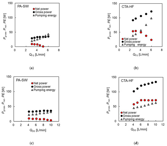 The gross power (Pgross), net power (Pnet), and pumping energy (PE) per a module as a function of flow rates of DS and FS, using PA-SW (a) and (c) and CTA-HF (b) and (d).