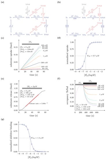 We parameterized the model in Figure 1a with a plausible set of rate constants (see Figure 1b). We assumed that ligands bind to the hypothetical transporter with rates that are not limited by diffusion [,]. As shown in Figure 1c–g, this minimal model is sufficient to predict the outcome of a wide range of experiments, which are typically performed to explore the function of a solute carrier. For instance, in Figure 1c we show the result of an in silico experiment in which we simulated the time-dependent substrate uptake on application of increasing substrate concentrations. We note that for the simulation, we assumed the intracellular substrate concentration (Sin) as zero (i.e., initial rate condition) and that the substrate was applied extracellularly for 1 min. Substrate uptake was modelled as the substrate dissociation from the inward-facing state: (k47*TiNaS). In Figure 1d, we plotted the amount of substrate that accumulated in the cell within 1 min as a function of the applied substrate concentration. We extracted the KM for substrate uptake as ~700 nM by fitting the synthetic data to the Michaelis–Menten equation. In Figure 1e, we conducted an in silico substrate release experiment. For the simulation, we further assumed that the cell had prior been loaded with substrate, upon which the intracellular substrate concentration reached 0.1 mM. The releaser, assumed to be an alternative substrate, can readily exchange with the substrate, which was accumulated within the cell, and thus lead to its release. Substrate release was modeled as the dissociation of the substrate from the outward-facing state (k32×ToNaS). As shown in Figure 1e, substrate is released over time upon extracellular application of a releaser (3 μM). From the slope of the curve, we determined the rate of substrate release as ~2 s−1. The illustration in Figure 1e shows that substrate is initially released at a lower basal rate prior to the application of the releaser. In Figure 1f, our kinetic model also emulated a radioligand binding experiment. The radioligand was assumed to be a transport incompetent inhibitor. We further assumed that the experiment was conducted in a vesicular membrane preparation in which there was no sodium gradient. In the simulation, we set the KD of the inhibitor to 10 nM. Figure 1f shows the state occupancy of ToNaI over time. In the in silico experiment, we waited until inhibitor binding had reached steady state (i.e., time-independent state occupancy), before we applied increasing concentrations of the substrate that competed for binding to the same transporter. The substrate binds to and prevents the inhibitor from forming complexes with the transporter, which results in a decrease in the state occupancy of ToNaI. At higher concentrations of the substrate, inhibitor binding to the transporter was reduced. In Figure 1g, we plotted the state occupancy of ToNaI as function of the applied substrate concentration ([S]o ranging from 10 nM to 100 μM). We extracted the potency for inhibitor displacement by the substrate (IC50 = ~1 μM), by fitting the synthetic data to the appropriate function (see legend in Figure 1).