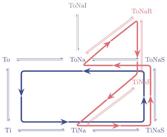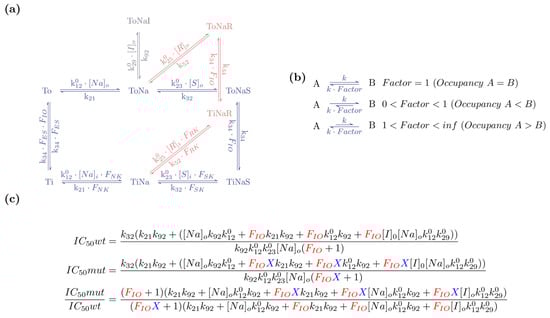 In Figure 1a, we show the kinetic scheme of the minimal model of a secondary active transporter. We assumed that the hypothetical transporter is energetically driven by the transmembrane gradient of sodium (Na). Accordingly, the scheme includes the apo-outward-facing state (To), the sodium-bound outward-facing state (ToNa), the ternary complex of the outward-facing state with sodium and substrate (ToNaS), and, in addition, the corresponding inward-facing states (Ti, TiNa, and TiNaS). The reactions connecting these states form a closed loop, which is referred to as the transport cycle. A kinetic model containing only these six states (shown in blue) is sufficient to predict substrate uptake through a transporter. However, substrate uptake is not the only aspect of transporter function, which is typically assessed when characterizing a secondary active transporter or mutated versions thereof. Other assays test the ability of a transporter to bind an inhibitor (e.g., KD of an inhibitor, measured in binding experiments) or measure release of cytosolic substrate on application of a releaser (i.e., amount of cytosolic substrate released on application of a synthetic or endogenous substrate). To account for these functions, we included an inhibitor bound state (ToNaI) and releaser bound states (ToNaR and TiNaR). The resulting addition of these states to the ones, which account for substrate uptake, allow for modelling the outcome of a broad range of transporter assays. We stress that this scheme is a minimal model and simplistic. In reality, secondary active transporters frequently function in ways that are more complex and require a comprehensive reaction schemes for faithful representation of transporter function. For instance, some utilize additional co-substrates such as chloride or potassium [,], while some may bind substrates and co-substrates in a random rather than a sequential order [,] or some may display ionic slippage [,]. In addition, many transporters are voltage-dependent. This voltage dependence can be the result of the binding of charged (co)substrate within the membrane electric field or conformational rearrangements, which move charge(s) through the electric field. However, the partial reactions associated with charge movement can differ between different transporters []. Hence, we refrained from incorporating arbitrary assignment of voltage dependence into the minimal model.