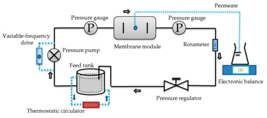 A flat-plate cross-flow filtration device was used for digestate purification. This device mainly consisted of pressure pump, pressure gauges, feed tank (3 L), membrane module, electronic balance, thermostatic circulator, etc. The size of the flat membrane modules are 130.0, 65.0, and 1.3 mm in length, width, and height, respectively, and its effective membrane area was 84.5 cm2. The membranes used in this experiment were provided by RisingSun Membrane technology (Beijing) Co., Ltd. (Beijing, China), and the membrane information is shown in Table 1. Figure 1 shows the flow chart of the device, featuring the digestate from the feed tank pumped into the membrane module. Two pressure gauges were mounted at both sides of the membrane module for transmembrane pressure monitoring. Meanwhile, the permeate flow was measured, and cross-flow velocity (CFV) and temperature were controlled. A volumetric flask (500 mL) and an electronic balance (Max: 800 g; Shanghai Tianmei Balance Instrument Co., Ltd. (Shanghai, China)) were used for the permeate flow monitoring. The CFV was controlled by a variable-frequency drive. Operating temperature was controlled by a thermostatic circulator (DTY-30B; Beijing Detianyou Technology Development Co., Ltd. (Beijing, China)). Before purifying the digestate, the UF membranes were soaked in deionized water for 40 min, and the whole system operated with deionized water as the feedstock until the flux remained stable.