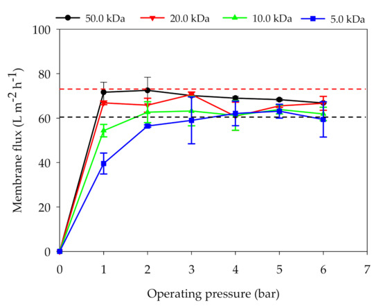 As presented in Figure 3, the flux increase rates of the four membranes can be arranged in the start-up stage (TMP < 3.0 bar) in the series that follows: 50.0 kDa > 20.0 kDa > 10.0 kDa > 5.0 kDa. It was revealed that the larger membrane pore size caused the faster flux increase rate with the increase in pressure. However, there is a mutually restrictive relationship between membrane flux and permeate quality using membrane purification. Under the same operating pressure, the UF membrane with a smaller pore size encountered a higher membrane inherent resistance in the digestate purification process, resulting in a higher permeate quality [25]. At 1.0 bar, the fluxes of 50.0 and 20.0 kDa membranes had already reached 65 L m−2 h−1 as the highest. However, the fluxes of 10.0 kDa and 5.0 kDa UF membranes were still rising at the same TMP. At 3.0 bar, all four UF membranes can reach to 60.0 L m−2 h−1 approximately. However, as the TMP exceeded 3.0 bar, the flux increase rates of the four membranes were almost zero. This phenomenon indicated that the TMP of the UF membrane should be lower than 3.0 bar during digestate purification. The reasons for this phenomenon may be that compressible organic aggregates (such as colloids and particles) in digestate accumulated on the membrane surface or penetrate into membrane pores under the higher TMP, resulting in serious membrane fouling. Magdalena et al. [30] found that an increase in TMP caused an increase in the total hydraulic resistance of membrane, resulting in more solid pollutants accumulating on the membrane surface and blocking the pores. Concentration polarization was also assumed to have an effect on the UF separation process, as the digestate contained a large amount of salts (EC = 7.7 ± 0.05 ms cm−1). Alexandre et al. [31] pointed out that the concentration polarization is more intense at higher TMP, leading to the formation of a more selective layer onto the membrane surface.