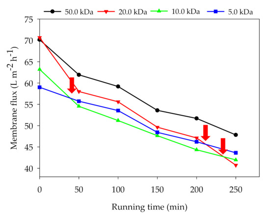 For the batch experiment, the fluxes of all membranes declined, with the gradual increase of feed concentration and the intensification of membrane fouling (Figure 5). After 40 min running, the flux of the 10.0 kDa membrane was lower than that of the 5.0 kDa membrane. At about 210 min, the flux of the 20.0 kDa membrane was also lower than that of the 5.0 kDa membrane. After 250 min running, the flux of the 50.0, 20.0, 10.0, and 5.0 kDa membranes were decreased by 31.8%, 42.4%, 336 %, and 26.1%, respectively. It was interesting that the 20.0 kDa membrane showed the worst flux maintenance ability. The membrane flux maintenance ability not only depends on the nature of the membrane material but also on the feed characteristics (particle size distribution, organic matter concentration) and operating parameters. Waeger et al. [25] found that membrane pores with a larger diameter are more susceptible to internal clogging through smaller particles. In this study, we assumed that the 20.0 kDa membrane was more likely to be blocked by particles than the 10.0/5.0 kDa membranes. The 50.0 kDa membrane maintained the highest membrane flux throughout the operating cycle, probably because the fine particles in the digestate can pass through larger membrane pores. The above results elucidated that the pore size of UF membrane does affect the changes of membrane flux and the formation of membrane fouling.