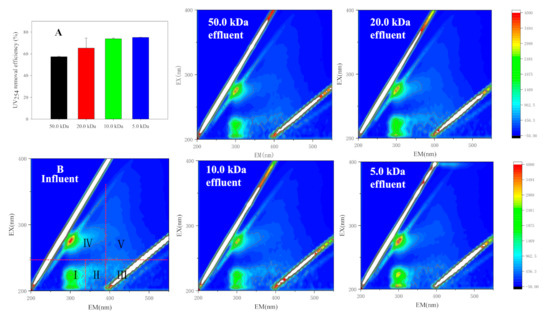 (A) UV254 removal rates of UF membranes with different pore size and (B) three-dimensional excitation emission matrix (3D-EEM) profiles.