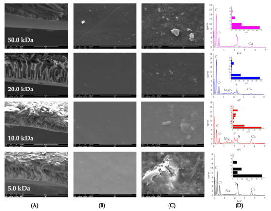SEM images of (A) cross-sections of UF membranes (×800), (B) virgin membrane surface (×10,000), (C) fouled membrane surface (×10,000), (D) energy-dispersive spectroscopy (EDS) of fouling.