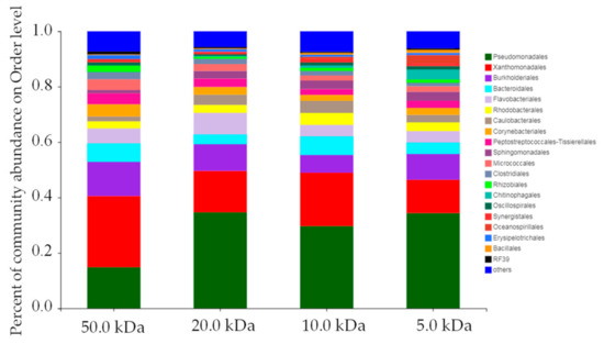 The relative abundance of the bacterial community of membrane fouling showed that more than 20 kinds of bacteria were detected on the order level (Figure 8). Among them, Pseudomonadales, Xanthomonadales, Burkholderiales, Bacteroidales, and Flavobacteriales were the dominant bacteria. The 50.0 kDa membrane was mainly polluted by Xanthomonadales; the other three membranes were mainly polluted by Pseudomonadales. The adsorption capacity of bacteria on the membrane surface is mainly related to membrane properties (surface electrical properties, hydrophilicity and hydrophobicity, etc.) and the characteristics of bacteria (size, metabolic type) [47,48]. It should be pointed out that bacteria attached to the surface of membrane may multiply and form biofilm. Therefore, it is necessary to control the bacterial contamination during digestate purification.