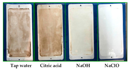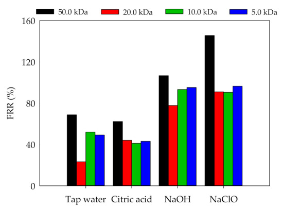 Membrane cleaning is one of the important procedures to maintain the high membrane flux. Membrane cleaning agents should be selected according to the type of pollutions. Four cleaning agents, namely tap water, citric acid, NaOH, and NaClO were selected for membrane cleaning (Figure 9). The results showed that (1) the tap water cleaning method is based on hydraulic flushing and dissolution. The FRRs after tap water cleaning were limited (FRRs < 70%) (Figure 10). Among the four membranes, 20.0 kDa membrane had the lowest FRR, indicating that it was easier to form membrane pore clogging. (2) Citric acid is used to clean inorganic pollutants of membrane fouling through dissolution and chelation. The FRRs after citric acid cleaning were less than 60%. (3) NaOH solution can hydrolyze and dissolve organic pollutants on the membrane, and the cleaning effects obtained by NaOH cleaning were better than those obtained by citric acid. (4) NaClO can oxidize and remove pollutants on the membrane surface or pores. The FRRs of 50.0, 20.0, 10.0, and 5.0 kDa membranes after NaClO cleaning were 145.5%, 90.9%, 90.5%, and 96.5%, respectively. The pore size of membrane also showed effects on FRR, and the 50.0 kDa membrane obtained higher FRRs under four cleaning methods, indicating that the larger membrane pore size were associated with the higher FRR.