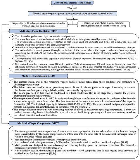 26]. The main conventional thermal technologies are multi-stage flash distillation (MSF), multi-effect distillation (MED), and mechanical vapor compression (MVC) (see