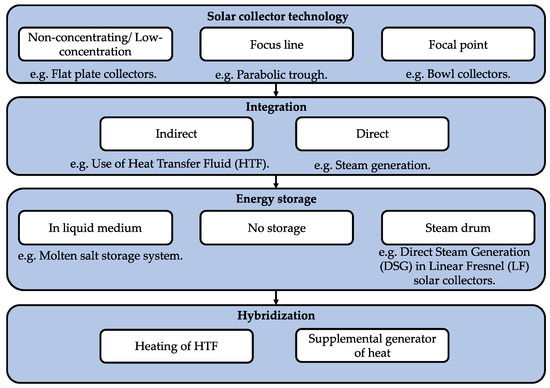 Figure 4 shows an overview of solar energy capture. Solar collector technology for thermal distillation processes depends on the maximum temperature level (Tm) in the evaporation–condensation phenomena, i.e., Tm < 130 °C, low-temperature solar energy (LTSE) and Tm > 130 °C, high-temperature solar energy (HTSE). LTSE is generated in non-concentrated or low-concentration collectors and uses simple solar fields, i.e., without moving parts and with low investment and low operating costs [