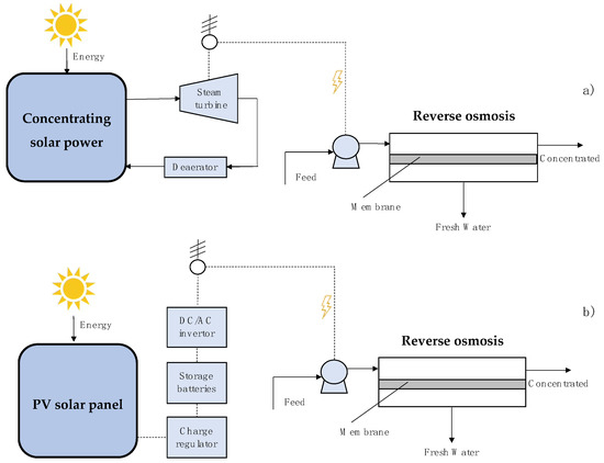 Figure 5b represents a desalination plant that uses photovoltaic cells and RO (PV/RO). This process is useful for small desalination equipment (<0.2 L/s) and brackish water that requires less pumping power [