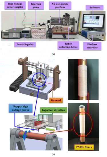 Poly (vinylidene fluoride) (PVDF) is a high molecular-weight polymer. Its copolymer has a high polarity and dielectric constant compared to that of PP and PE []. Controllable fibers with diameters ranging from a few micrometers to even a few nanometers can be fabricated using near-field electrospinning (NFES) [,]. But unlike conventional electrospinning, NFES needs only a short distance to produce continuous fibers.