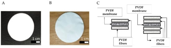 Fabrication of PVDF fiber-membrane separators; (A) membrane with pore size of 220 nm, (B) membrane with pore size of 450 nm, and (C) sandwich technique for preparing monolayer and bilayer fiber-membrane separators.