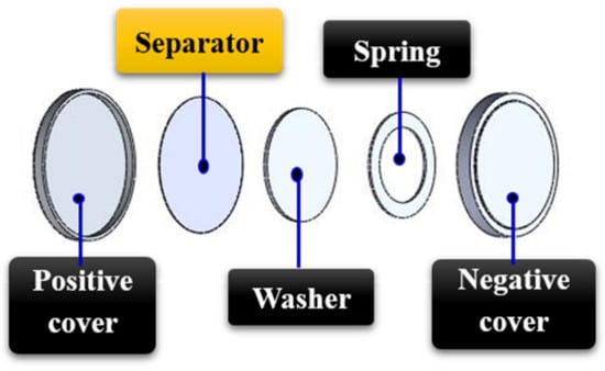 The coin cell consisting of a separator soaked in electrolyte (LiPF6–based solution lot number AD1710, purchased from Eternal Materials Co., Ltd., Hsinchu City, Taiwan) and two symmetrical stainless-steel plates was assembled, as shown in Figure 3. The ionic conductivity of the electrolyte soaked in separator was evaluated using the electrochemical impedance spectroscopy (EIS) measurement (AutoLab, PGSTAT302N, Metrohm) under room temperature. The amplitude was set at 10 mV while the electrical frequency was set at 1 Hz to 1 MHz by applying AC voltage. Finally, the real impedance was calculated using the ion conductivity equation shown in Equation (3), where L is the membrane thickness, R is the resistance, and A is the membrane area.