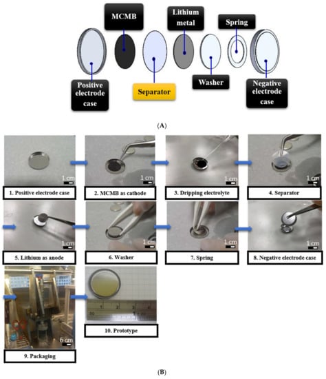 The coin battery, consisting of a stainless-steel plate, lithium metal, Mesocarbon microbeads (MCMB), electrolyte, and separator, was assembled as shown in Figure 4A. In this study, the MCMB electrode sheets were used as the cathode and lithium metal as the anode. As shown in Figure 4B, there are 10 steps to completing a prototype. First, the positive electrode case was prepared (step 1). Then MCMB as the cathode was attached atop (2), followed by the dripping electrolyte (3). Then the separator was put on the top of the MCMB (4). After that, lithium as the anode was put on top of the separator (5), followed by a washer (6) and spring (7), respectively. Finally, a negative electrode case (8) was put in place to complete the packaging process, (9) all in the glove box. The prototype is shown in (10). When dripping the electrolyte, be aware that too much or too little can affect the yield of the assembled battery. To avoid elemental contact that could cause the battery to short circuit, all parts must be aligned in the center during assembly. A cyclic voltammetry (CV) test was conducted to examine the electrochemical characteristics using CHI 727C purchased from CH Instruments.