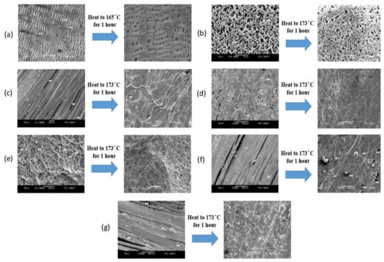 SEM images showing the effect of heating on the pore size of the PP separator and PVDF fiber-membranes; (a) pore size of PP separator when heated to 165 °C for 1 h, at 5000× magnification, (b) pore size of the 220 nm PVDF membrane when heated to 173 °C for 1 h, at 5000× magnification, (c) pore size of the 220 nm PVDF membrane sandwiched between a monolayer of electrospun fibers when heated to 173 °C for 1 h, at 1000× magnification, (d) pore size of the 220 nm PVDF membrane sandwiched between a bilayer of electrospun fibers when heated to 173 °C for 1 h, at 500× magnification, (e) pore size of the 450 nm PVDF membrane heated to 173 °C for 1 h, at 2000× magnification, (f) pore size of the 450 nm PVDF membrane sandwiched between a monolayer of electrospun fibers when heated to 173 °C for 1 h, at 500× magnification, and (g) pore size of the 450 nm PVDF membrane sandwiched by a bilayer of electrospun fibers when heated to 173 °C for 1 h, at 500× magnification.