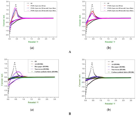 (A). Comparison of CV graphs of the separators: (a) PP separator versus 220 nm PVDF fiber-membranes sandwiched between mono- and bi-layers of electrospun fibers; (b) PP separator versus 450 nm PVDF fiber- membranes sandwiched between mono- and bi-layers of electrospun fibers; (B). Comparison of CV graphs: (a) CV graphs of substrate with best conductivities after coating with sol-gel; (b) CV graphs of the substrate after sol-gel coating showing that the ion conductivity is similar to the PP separator.