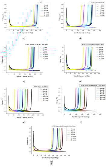 (A) Comparison of charge-discharge curves; (a) PP separator, (b) 220 nm PVDF membrane, (c) 220 nm PVDF membrane sandwiched in fiber monolayer, (d) 220 nm PVDF membrane sandwiched in fiber bilayer, (e) 450 nm PVDF membrane, (f) 450 nm PVDF membrane sandwiched in fiber monolayer, and (g) 450 nm PVDF membrane sandwiched in fiber bilayer, (B) Comparison of charge and discharge curves; (a) A4 paper with BX900 coating, (b) rice paper with BX900 coating, (c) nonwoven fabric with BX900 coating, (d) carbon synthetic fabric with BX900 coating, (e) nonwoven fabric with BX100 coating, and (f) carbon synthetic fabric with BX100 coating.