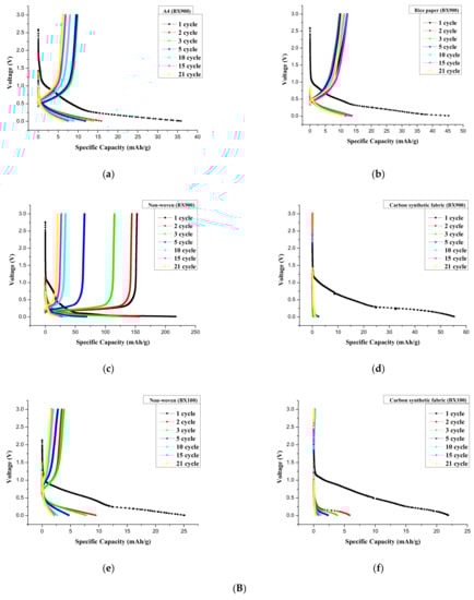 A4 paper, rice paper, nonwoven fabric and carbon synthetic fabric were coated with sol-gel and used as separators in an assembled button battery. The charge and discharge test of the assembled battery was carried out for 21 cycles at the 0.2 C current density. The 1, 2, 3, 5, 10, 15, and 21 cycles were selected to construct the graphs shown in Figure 10B. The lithium ion battery using A4 paper coated with BX900 registered a capacity of ~36.3 mAh/g. The lithium-ion battery using rice paper coated with BX900 registered a capacity of ~46 mAh/g. Finally, the lithium-ion battery using nonwoven fabric with BX900 and BX100 coating had a capacity of ~224 mAh/g and ~25 mAh/g, respectively.
