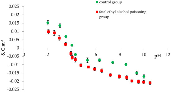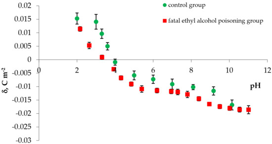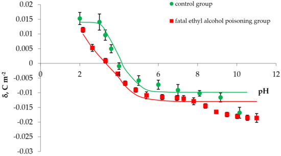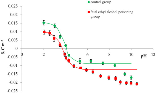 The experimental values of the surface charge densities of erythrocyte and thrombocyte membranes (control and fatal ethyl alcohol poisoning groups) versus pH are presented in Figure 1 and Figure 2, respectively. We determined the surface charge density values based on experimental electrophoretic mobility data using Equation (1). All measurements were carried out at several pH values, using the basic electrolyte (0.155 M NaCl).