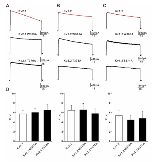 Effects of the mutation of the time constants of the inactivation of the Kv2.1, Kv2.2, and Kv1.2 channels. The inactivation time constants for the wild-type and mutant Kv channels were determined by fitting a 5-s depolarization at +20 mV with single exponentials. Red lines show the representative fitting trajectories of the current traces. (A). Representative currents for the Kv2.1 wild-type, W365A, and T370A mutant channels (5-s pulses from −100 mV to 20 mV) (B). Representative currents for the Kv2.2 wild-type, W373A, and T378A mutant channels. (C) Representative currents for the Kv1.2 wild-type, W366A, and S371A mutant channels. (D) Comparison of the time constants of the inactivation of the wild-type and mutant Kv channels, n = 6~12, p > 0.05 (wild type versus mutants).