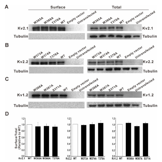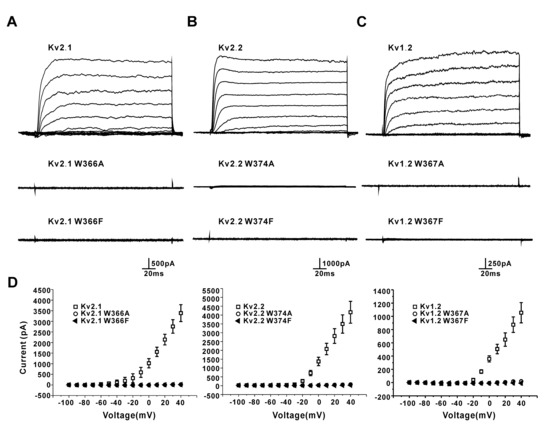 3.2. Mutation of a Conserved Tryptophan Residue Resulted in the Loss of Function of the Kv2.1, Kv2.2, and Kv1.2 Channels in HEK293 Cells