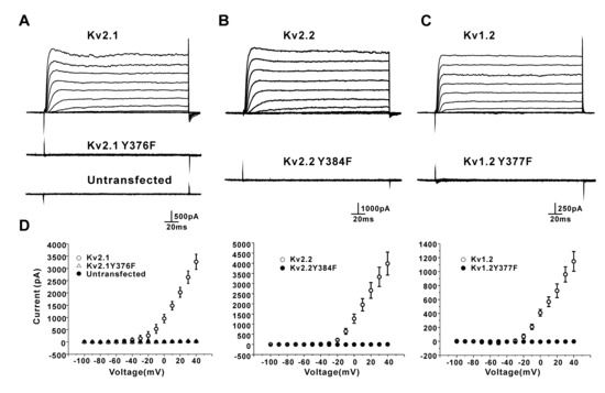 3.3. Y376F (Kv2.1), Y384F (Kv2.2), and Y377F (Kv1.2) Mutations Resulted in Complete Loss of K+ Conductance of the Kv Channels Expressed in the HEK293 Cells